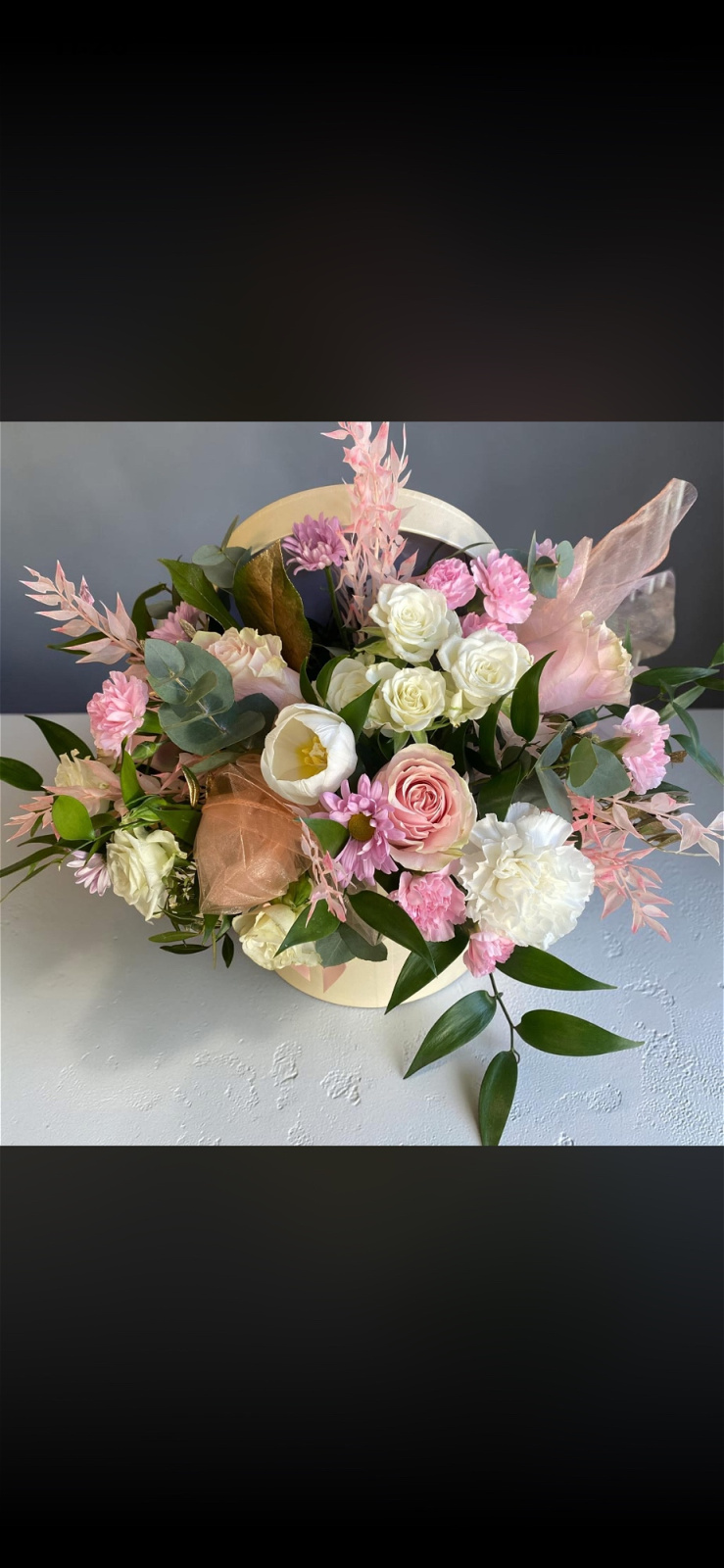 Hatbox incorporating pinks and white flowers